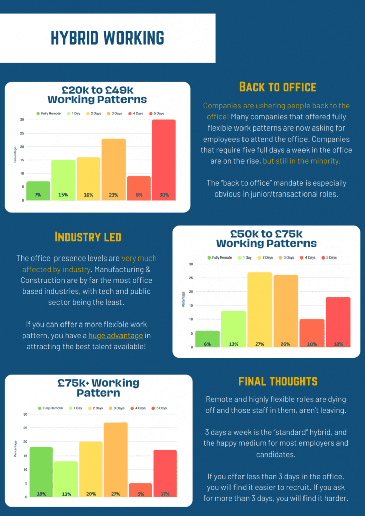 5 days a week: A growing trend, much harder to recruit for and candidates tend to ask for 10-15% more ££ to do the same role.